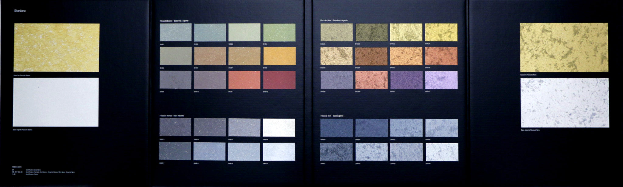 Shardana se nanáší štětcem a dokončuje plastovou špachtlí a je k dispozici ve ZLATÉ a STŘÍBRNÉ bázi, s černými a bílými vločkami.